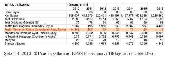 FETÖ'nün, sorularının sınav öncesinde sızdırıldığı belirlenen 2010 KPSS'nin Türkçe testi istatistiklerinden bahsedilen raporda, soru hırsızlığını kanıtlar nitelikte bulgular yer aldı. Rapordaki istatistiklere göre, Türkçe testini tam cevaplayanların sayısının 2010 yılında zirve yaptığı görülüyor. 808 bin kişinin girdiği 2010 KPSS Türkçe testini tam cevaplandıranların sayısı 14 bin 368 oldu. Bu oran, bir yıl sonra 2011'de gerçekleştirilen KPSS'de ciddi bir düşüşle 805'te kaldı. 2010'dan sonra her geçen yıl Türkçe testini tam cevaplandıranların sayısı sınava giren kişi sayısı artmasına rağmen düşmeye devam etti. Öyle ki 2016 yılında sınava 1 milyon 225 bin 560 kişi girmesine rağmen Türkçe testini tam cevaplandıranların sayısı yaklaşık bin kat düşerek 15 oldu.