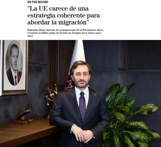 Cumhurbaşkanlığı İletişim Başkanı Fahrettin Altun, El Mundo'ya verdiği mülakatta Türk halkının 15 Temmuz'daki demokrasi zaferi, Türkiye'nin FETÖ ve diğer terör örgütleriyle mücadelesi, Avrupa'nın FETÖ tutumu ve Türkiye-AB ilişkileri üzerine değerlendirmelerde bulundu. Avrupa'da son yıllarda İslamofobi ve yabancı karşıtlığının bir fonksiyonu olarak Cumhurbaşkanı Erdoğan'a yönelik bir saplantı geliştiğini kaydeden Altun, "Türkiye'yle ilgili her şey Recep Tayyip Erdoğan üzerinden yorumlanıyor. Pozisyonlar buna göre alınıyor. Üzülerek söylüyorum ki bu saplantının doğal bir sonucu Türkiye'yle ilgili her türlü dezenformasyonun alıcı bulmasıdır. Maalesef ortaya atılan iddialar hızla yayılıyor; iddianın yanlış olduğu ortaya çıkınca kimse geriye dönüp bu iddia nereden çıkmıştı, bu dezenformasyonun yayılmasına kimler yardımcı olmuştu diye sormuyor. 15 Temmuz'la ilgili ortaya atılan iddialarla '11 Eylül'ü Amerikan derin devleti yaptı' veya 'ETA'yı İspanyol devleti kurdurdu' gibi saçma önermeler arasında hiçbir fark yoktur" dedi.