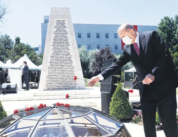 FETÖ'cü hain pilotlar tarafından ilk bombanın atıldığı yere yapılan 15 Temmuz Anıtı'nın önünde düzenlenen törene Başkan Erdoğan da katıldı. Anıta karanfil bırakan Erdoğan, konuşmasında şu mesajları paylaştı: