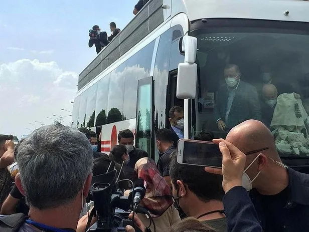 Erdoğan kendine sevgi gösterisinde bulunan vatandaşları otobüsten selamlayarak hediye dağıttı.