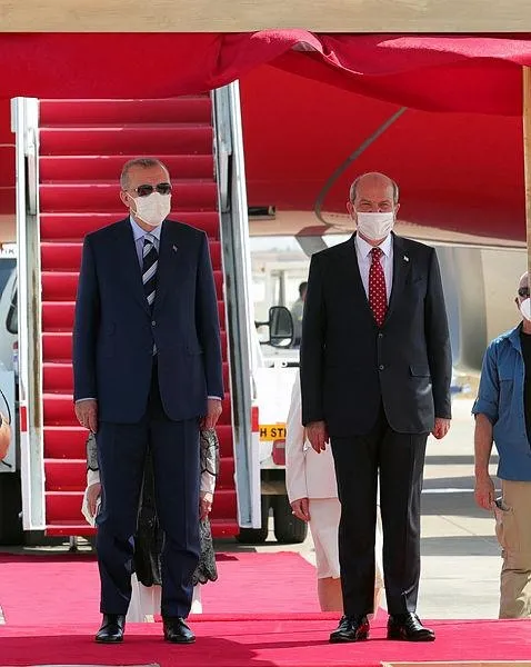 Özel uçakla yerel saatle 15.40'da Ercan Havalimanı'na gelen Erdoğan, KKTC Cumhurbaşkanı Tatar tarafından resmi törenle karşılandı.