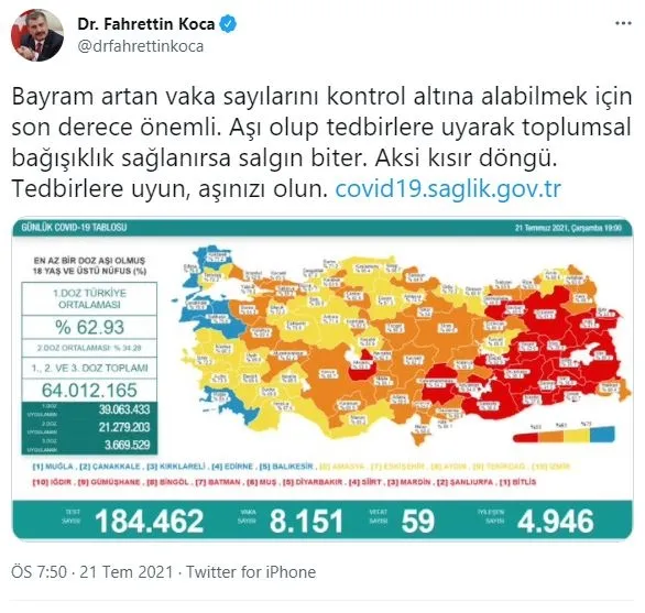 Sosyal medya hesabından günlük tabloyu paylaşan Sağlık Bakanı Fahrettin Koca, "Bayram artan vaka sayılarını kontrol altına alabilmek için son derece önemli. Aşı olup tedbirlere uyarak toplumsal bağışıklık sağlanırsa salgın biter. Aksi kısır döngü. Tedbirlere uyun, aşınızı olun." değerlendirmesini yaptı.