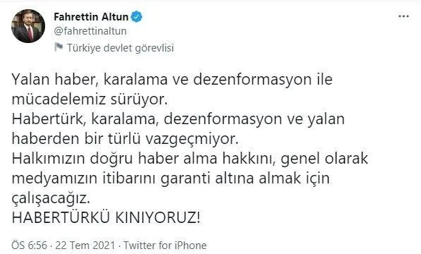 İletişim Başkanı Fahrettin Altun, Altaylı ve yalan merkezi olan Habertürk'e tepki gösterdi. Altun,"Habertürk, karalama, dezenformasyon ve yalan haberden bir türlü vazgeçmiyor. Habertürk'ü kınıyoruz" dedi.