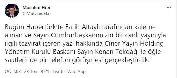 Bugün Habertürk'te Fatih Altaylı tarafından kaleme alınan ve Sayın Cumhurbaşkanımızın bir canlı yayınıyla ilgili tezvirat içeren yazı hakkında Ciner Yayın Holding Yönetim Kurulu Başkanı Sayın Kenan Tekdağ ile öğle saatlerinde bir telefon görüşmesi gerçekleştirdik.