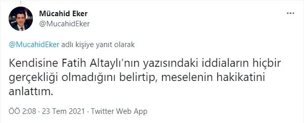 Kendisine Fatih Altaylı'nın yazısındaki iddiaların hiçbir gerçekliği olmadığını belirtip, meselenin hakikatini anlattım.