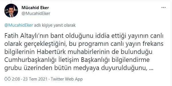 Fatih Altaylı'nın bant olduğunu iddia ettiği yayının canlı olarak gerçekleştiğini, bu programın canlı yayın frekans bilgilerinin Habertürk muhabirlerinin de bulunduğu Cumhurbaşkanlığı İletişim Başkanlığı bilgilendirme grubu üzerinden bütün medyaya duyurulduğunu, ...
