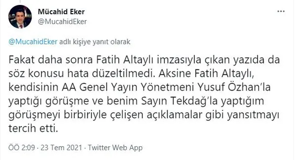 Fakat daha sonra Fatih Altaylı imzasıyla çıkan yazıda da söz konusu hata düzeltilmedi. Aksine Fatih Altaylı, kendisinin AA Genel Yayın Yönetmeni Yusuf Özhan'la yaptığı görüşme ve benim Sayın Tekdağ'la yaptığım görüşmeyi birbiriyle çelişen açıklamalar gibi yansıtmayı tercih etti.