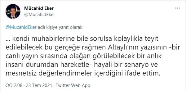 ... kendi muhabirlerine bile sorulsa kolaylıkla teyit edilebilecek bu gerçeğe rağmen Altaylı'nın yazısının -bir canlı yayın sırasında olağan görülebilecek bir anlık insani durumdan hareketle- hayali bir senaryo ve mesnetsiz değerlendirmeler içerdiğini ifade ettim.