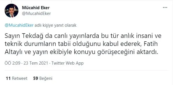 Sayın Tekdağ da canlı yayınlarda bu tür anlık insani ve teknik durumların tabii olduğunu kabul ederek, Fatih Altaylı ve yayın ekibiyle konuyu görüşeceğini aktardı.