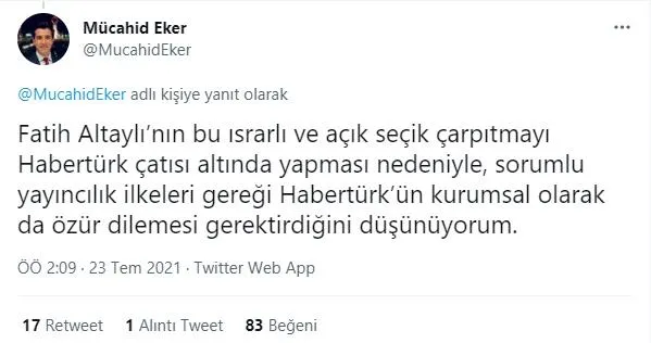 Fatih Altaylı'nın bu ısrarlı ve açık seçik çarpıtmayı Habertürk çatısı altında yapması nedeniyle, sorumlu yayıncılık ilkeleri gereği Habertürk'ün kurumsal olarak da özür dilemesi gerektirdiğini düşünüyorum.