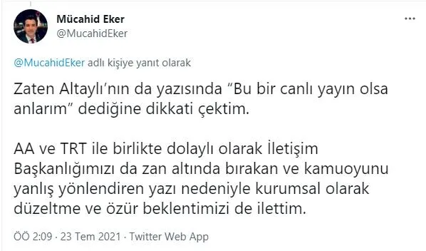 Zaten Altaylı'nın da yazısında "Bu bir canlı yayın olsa anlarım" dediğine dikkati çektim. AA ve TRT ile birlikte dolaylı olarak İletişim Başkanlığımızı da zan altında bırakan ve kamuoyunu yanlış yönlendiren yazı nedeniyle kurumsal olarak düzeltme ve özür beklentimizi de ilettim.