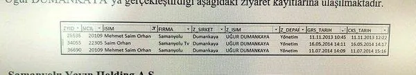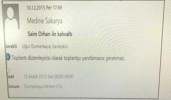 Şirketin silinen kayıtlarında, Dumankaya Merkez ofisinde Uğur Dumankaya ile Mehmet Saim Orhan'ın 10 Aralık 2015'te kahvaltı yaptıkları da ortaya çıkarıldı.