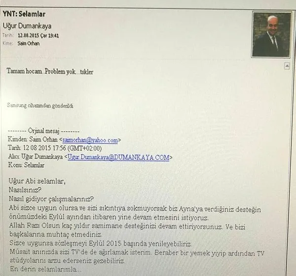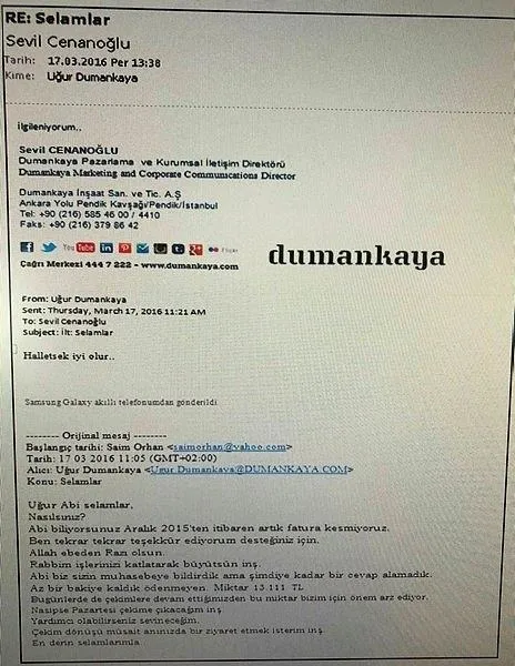 FETÖ'nün iş dünyası yapılanmasına ilişkin Dumankaya Şirketler Grubu'na yönelik yargılanması devam eden 63 sanıklı davaya, şirkete atanan kayyum heyetinin gönderdiği rapor damga vurdu. Dava dosyasına giren raporda, Dumankaya ailesinin FETÖ'nün yayın organı Samanyolu TV programlarından Ayna'nın yapımcısı Mehmet Saim Orhan'la yaptığı yazışmalar deşifre oldu.