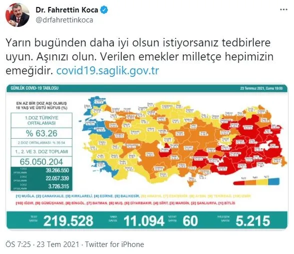 Tabloyu paylaşan ve aşı çağrısında bulunan Sağlık Bakanı Fahrettin Koca, "Yarın bugünden daha iyi olsun istiyorsanız tedbirlere uyun. Aşınızı olun. Verilen emekler milletçe hepimizin emeğidir." ifadelerini kullandı.