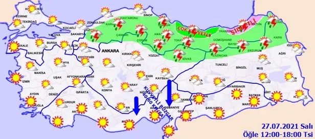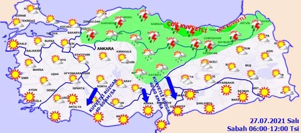 Rize ve Artvin'de yaşanan sel felaketinin yaraları sarılırken Meteoroloji Genel Müdürlüğünden peş peşe uyarılar gelmeye devam ediyor. Yapılan son değerlendirmelere göre, yağışların Orta ve Doğu Karadeniz kıyılarında kuvvetli, Ordu, Giresun ile Trabzon'un batısında yer yer çok kuvvetli ve şiddetli, Rize ile Artvin'in kıyı kesimlerinde şiddetli ve aşırı olması bekleniyor. Uyarılar sonrası Trabzon'da 18 ilçedeki camilerden anons yapılırken Ordu'da Vali Tuncay Sonel'in başkanlığında acil durum toplantısı yapıldı. Öte yandan Ani sel, heyelan ve taşkın uyarılarında bulunduğu Doğu Karadeniz Bölgesi’ndeki Rize ve Artvin’de yağış etkili olmaya başladı. Peki, İstanbul, Ankara ve İzmir'de hava nasıl olacak? İşte il il 27 Temmuz hava durumu raporu.
