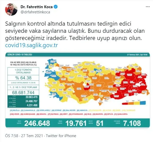 Son dakika: Sağlık Bakanlığı 27 Temmuz 2021 koronavirüs vaka, vefat ve aşı tablosunu paylaştı