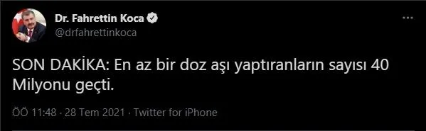 Bakan Koca, sosyal medyadan yaptığı açıklamada, en az bir doz aşı yaptıranların sayısının 40 milyonu geçtiğiniz bildirdi.