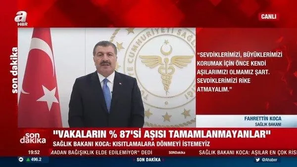 Sağlık Bakanı Fahrettin Koca, Koronavirüs Bilim Kurulu Toplantısının ardından önemli açıklamalarda bulundu. Vakaların yükselme eğiliminde olduğunun altını çizen Bakan Koca, "İki doz aşı olmadan bağışıklık olmuyor" ifadelerini kullandı. Koca, "Şu an aktif vakalarımızın yaklaşık %87'si aşısı tamamlanmamış kişiler. Hastanede yatan hastalarımızın yüzde 95'i aşısı tamamlanmamış kişiler" dedi ve kısıtlamaların gündemde olmadığını söyledi.