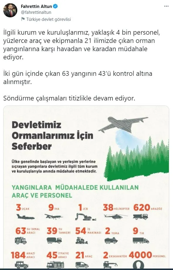 Yangın söndürme çalışmaları devam ederken konuya ilişkin İnfografik bir paylaşım yapan Cumhurbaşkanlığı İletişim Başkanı Fahrettin Altun, "İlgili kurum ve kuruluşlarımız, yaklaşık 4 bin personel, yüzlerce araç ve ekipmanla 21 ilimizde çıkan orman yangınlarına karşı havadan ve karadan müdahale ediyor. " ifadelerine yer verdi.