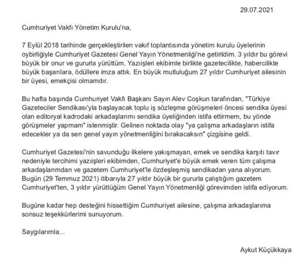 Sosyal medya hesabından açıklama yapan Küçükkaya, Cumhuriyet Vakfı Başkanı Alev Coşkun'un kendisine 'sendika üyesi gazetecileri istifa etmeye zorlaması' yönünde istekte bulunduğunu belirterek, "Gelinen noktada 'ya çalışma arkadaşların istifa edecekler ya da sen genel yayın yönetmenliğini bırakacaksın' çizgisine geldi" ifadelerini kullandı.