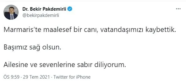 Tarım ve Orman Bakanı Bekir Pakdemirli Marmaris'te meydana gelen yangında 1 vatandaşın hayatını kaybettiğini duyurdu. Pakdemirli yaptığı açıklamada, "Marmaris'te maalesef bir canı, vatandaşımızı kaybettik. Başımız sağ olsun. Ailesine ve sevenlerine sabır diliyorum." ifadelerine yer verdi.