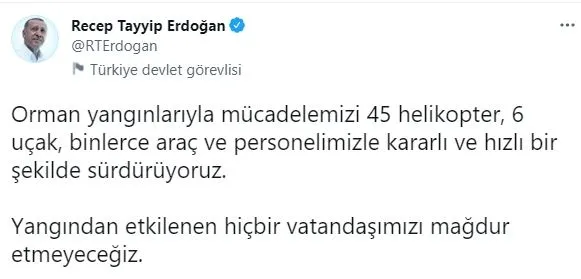 19.28 Başkan Recep Tayyip Erdoğan, "Orman yangınlarıyla mücadelemizi 45 helikopter, 6 uçak, binlerce araç ve personelimizle kararlı ve hızlı bir şekilde sürdürüyoruz. Yangından etkilenen hiçbir vatandaşımızı mağdur etmeyeceğiz" dedi.