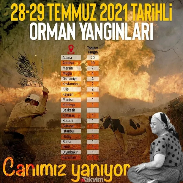 Son iki günde Antalya, Mersin, Adana, Osmaniye, Maraş, Kütahya, Kocaeli, Aydın, Hatay, Kayseri ve Kilis'te ormanlık alanlar alevlere teslim oldu. Yangınlarla ilgili soruşturma sürerken bir yandan da söndürme çalışmaları devam ediyor. Sabah saatleriyle çalışmalar yeniden başladı.