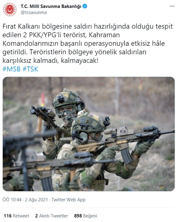 "Fırat Kalkanı bölgesine saldırı hazırlığında olduğu tespit edilen 2 PKK/YPG'li terörist, Kahraman Komandolarımızın başarılı operasyonuyla etkisiz hâle getirildi. Teröristlerin bölgeye yönelik saldırıları karşılıksız kalmadı, kalmayacak!"