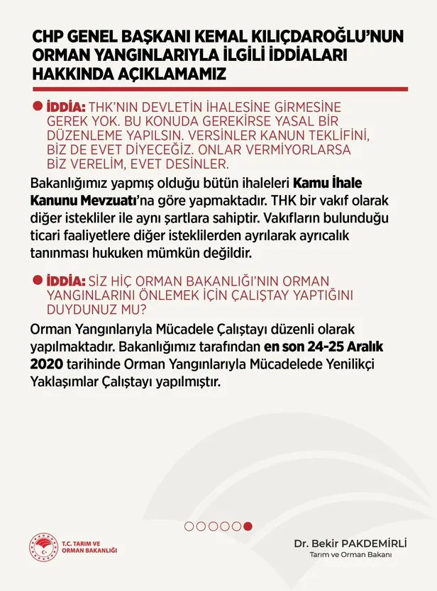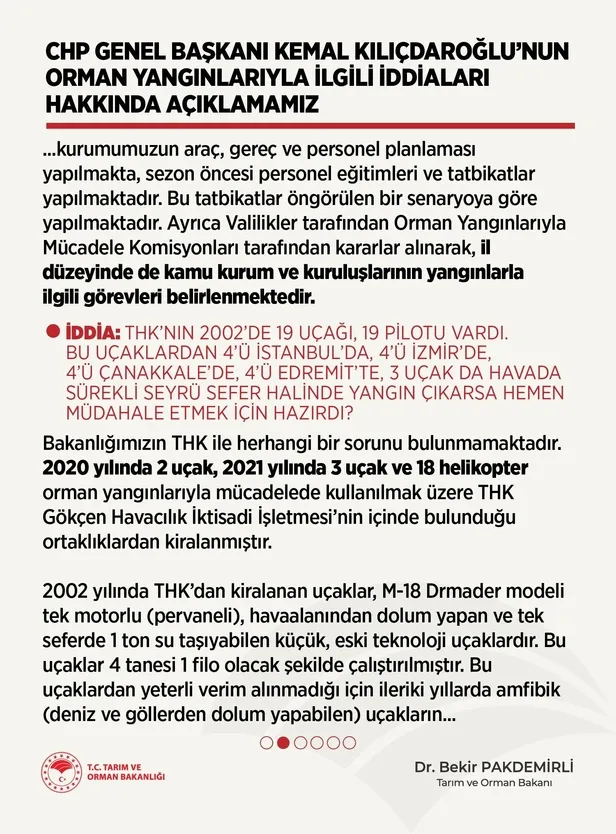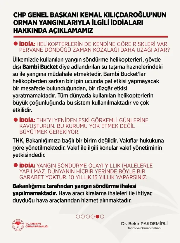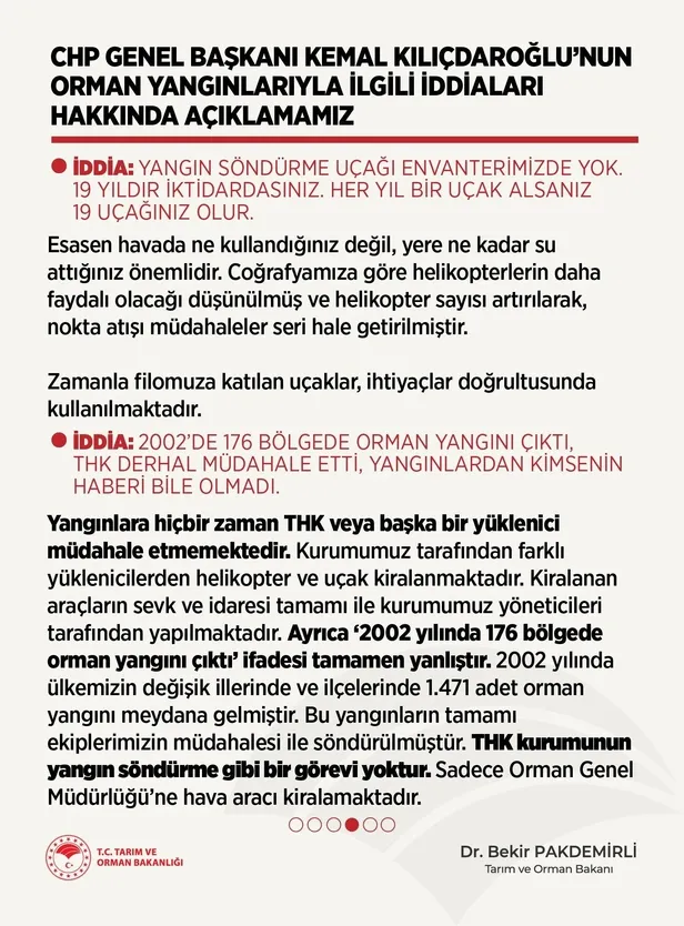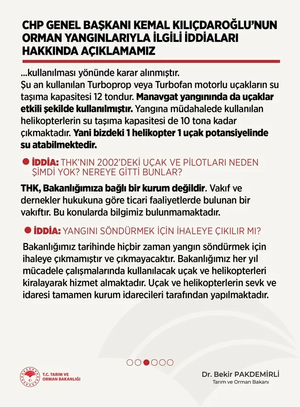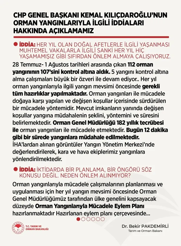 Tarım ve Orman Bakanlığı, özellikle CHP lideri Kemal Kılıçdaroğlu'nun başını çektiği yalan ve algı lobisine yanıt verdi. Yangını bile fırsat bilip siyasi rant peşine düşen zihniyetin iddiaları madde madde çürütüldü.