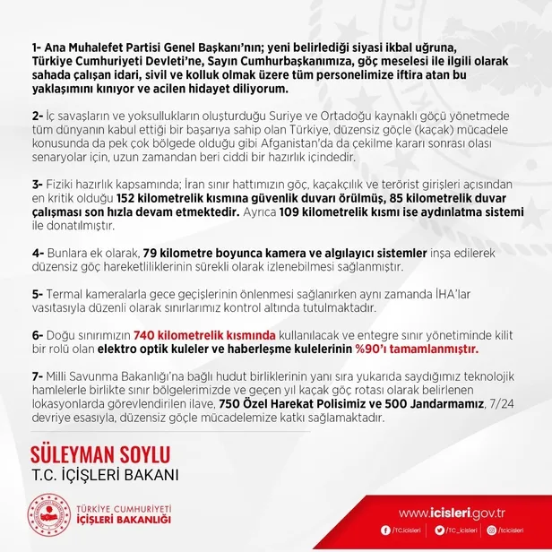 İçişleri Bakanı Süleyman Soylu, Cumhuriyet Halk Partisi (CHP) Genel Başkanı Kemal Kılıçdaroğlu'na yaptığı açıklama ile cevap verdi. Soylu, yazılı yaptığı açıklamada "Muhalefet Partisi Genel Başkanı'nın; yeni belirlediği siyasi ikbal uğruna, Türkiye Cumhuriyeti Devleti'ne, Sayın Cumhurbaşkanımıza, göç meselesi ile ilgili olarak sahada çalışan idari, sivil ve kolluk olmak üzere tüm personelimize iftira atan bu yaklaşımını kınıyor ve acilen hidayet diliyorum. İç savaşların ve yoksullukların oluşturduğu Suriye ve Ortadoğu kaynaklı göçü yönetmede tüm dünyanın kabul ettiği bir başarıya sahip olan Türkiye, Düzensiz Göçle (kaçak) mücadele konusunda da pek çok bölgede olduğu gibi Afganistan'da da çekilme kararı sonrası olası senaryolar için, uzun zamandan beri ciddi bir hazırlık içindedir. Fiziki hazırlık kapsamında; İran sınır hattımızın göç, kaçakçılık ve terörist girişleri açısından en kritik olduğu 152 kilometrelik kısmına güvenlik duvarı örülmüş, 85 kilometrelik duvar çalışması son hızla devam etmektedir. Ayrıca 109 kilometrelik kısmı ise aydınlatma sistemi ile donatılmıştır. Bunlara ek olarak, 79 kilometre boyunca kamera ve algılayıcı sistemler inşa edilerek düzensiz göç hareketliliklerinin sürekli olarak izlenebilmesi sağlanmıştır" ifadelerini kullandı.