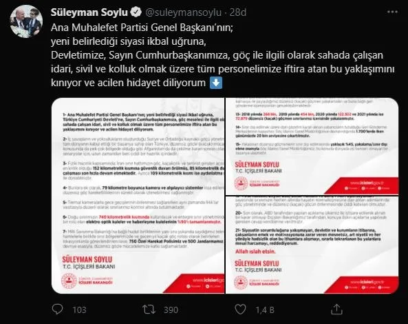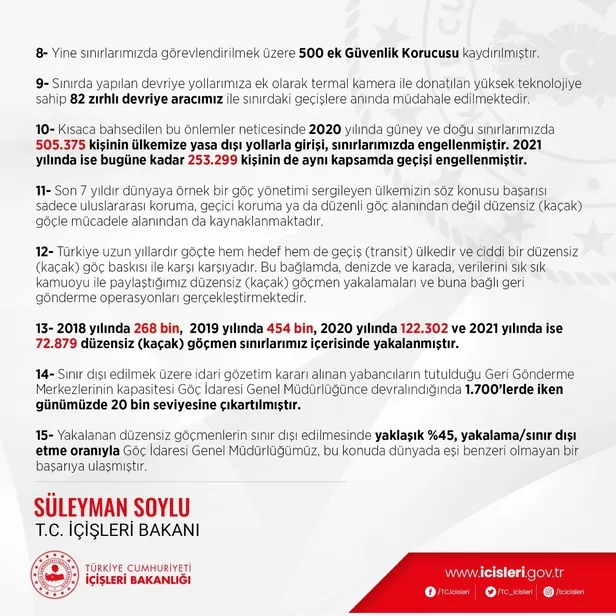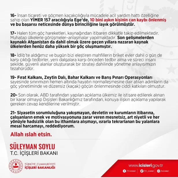 "Sınır dışı edilmek üzere idari gözetim kararı alınan yabancıların tutulduğu Geri Gönderme Merkezlerinin kapasitesi Göç İdaresi Genel Müdürlüğünce devralındığında 1700'lerde iken günümüzde 20 bin seviyesine çıkartılmıştır. Yakalanan düzensiz göçmenlerin sınır dışı edilmesinde yaklaşık yüzde 45, yakalama/sınır dışı etme oranıyla Göç İdaresi Genel Müdürlüğümüz, bu konuda dünyada eşi benzeri olmayan bir başarıya ulaşmıştır. İnsan ticareti ve göçmen kaçakçılığıyla mücadele acil yardım hattı özelliğine sahip olan YİMER 157 aracılığıyla Ege'de, 10 bini aşkın kişinin can kaybı önlenmiş ve bu başarısı neticesinde dünya birinciliğine layık görülmüştür. Halen tüm göç hareketleri, kaynağından itibaren dikkatle takip edilmektedir. Muhatap ülkelerle görüşmeler–anlaşmalar yapılmaktadır. Son gelişmelerden kaynaklı Afganistan da dahil olmak üzere geçen yıllara nazaran kaynak ülkelerden henüz daha yüksek bir göç oluşmamıştır. İdlib'te aldığımız ve bugün bizi eleştiren mahfillerin briket evler dahil o gün de karşı çıktığı tedbirler, yeni dalgalara karşı önceden tedbir alma ve süreci insani şekilde, güvenli alanlar oluşturarak bir strateji dahilinde yönetme anlayışımızın tezahürüdür. Fırat Kalkanı, Zeytin Dalı, Bahar Kalkanı ve Barış Pınarı Operasyonları sayesinde sınırımızın hemen altında hayatın normalleşmesine dair atılan adımların da göç yönetiminde ve düzensiz (kaçak) göçün önlenmesinde ciddi katkıları olmuştur. Son olarak, ABD tarafından yapılan açıklama ülkemiz ile istişare edilerek alınan bir karar olmayıp Dışişleri Bakanlığımız tarafından, konuya ilişkin açıklama yapılarak gereken cevap kendilerine verilmiştir. Siyasetin sorumluluğuna yakışmayan, devletin ve kurumların itibarına, çalışanların emek ve motivasyonuna zarar veren mesnetsiz, art niyetli ve her yönüyle hadsizlik olan bu ithamlara alışmayı, ısrarla tekrarlanan bu yalanlara mesai harcamayı, reddediyorum. Allah ıslah etsin."