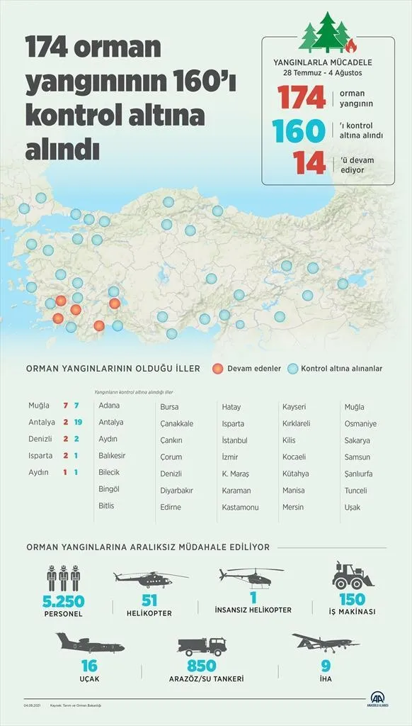Orman Genel Müdürlüğü, 28 Temmuz'dan bu yana çıkan 174 yangının 160'ının kontrol altına alındığını, 14'ünün devam ettiğini bildirdi.
