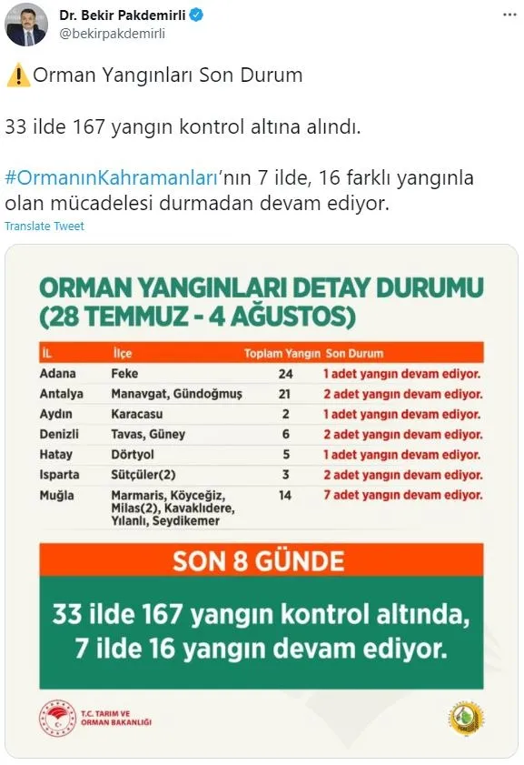 Pakdemirli, Twitter hesabından, orman yangınlarıyla ilgili son durumu, ayrıntıları içeren bir infografikle paylaşarak, şu ifadeleri kullandı: