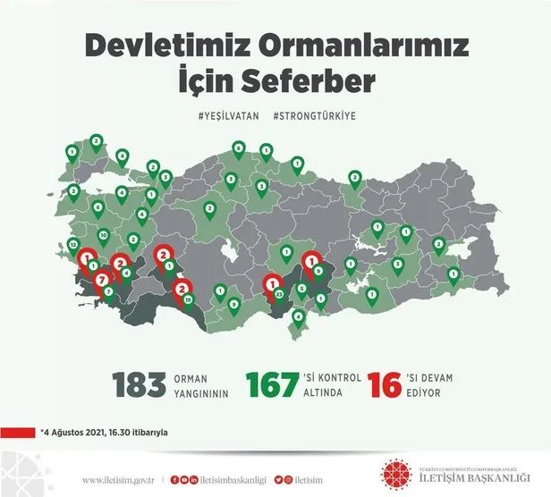 İletişim Başkanlığı'nın Twitter'daki hesabından yapılan açıklamada, devletin ormanlar için seferber olduğu belirtildi. Açıklamada, "28 Temmuz-04 Ağustos 2021 tarihleri arasında, ülkemizde meydana gelen 174 adet orman yangınının 161'i devletimizin tüm imkanları seferber edilerek kontrol altına alınmıştır" denildi.