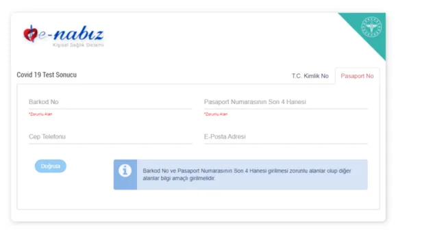 Test alınma sırasında size verilecek olan barkod numaranızla ve pasaport numaranızla birlikte TC Kimlik Numaranızla Sağlık Bakanlığı'nın e-Nabız uygulaması ile sonuçlar görüntüleniyor.