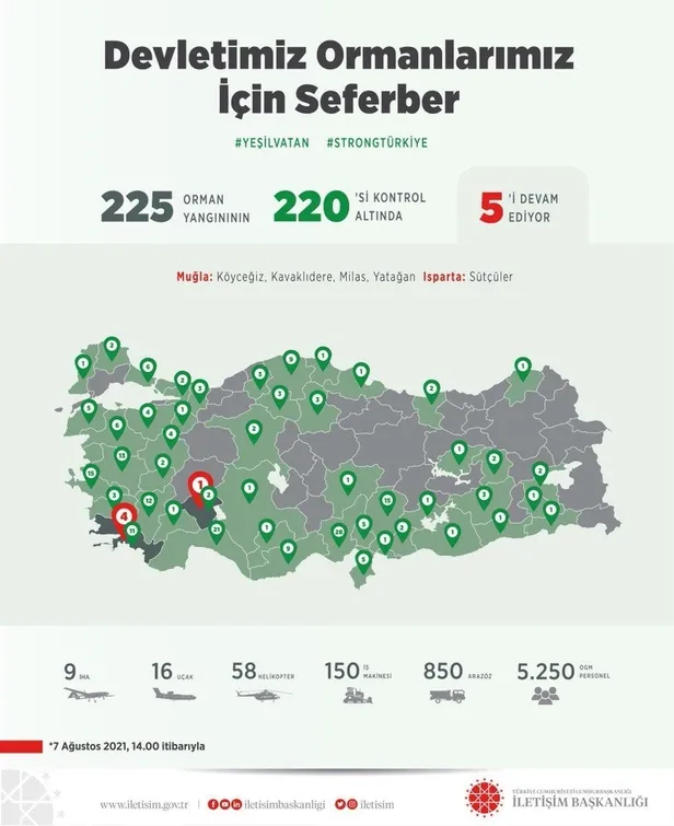 15.55 İletişim Başkanı Fahrettin Altun, sosyal medyadan yaptığı açıklamada "Ekiplerimizin yoğun gayretleri neticesinde 225 yangının 220'si kontrol altına alındı. İnşallah Muğla ve Isparta'da devam eden 5 yangını da en kısa sürede söndüreceğiz." ifadelerine yer verdi.