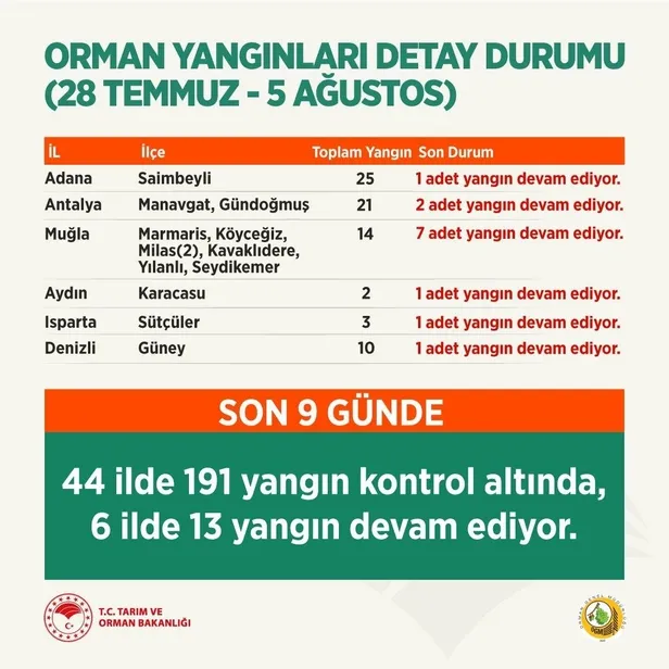 İletişim Başkanlığı'nın Twitter'daki hesabından, saat 09.45 itibarıyla orman yangınlarına ilişkin son durum paylaşıldı. Açıklamada, "Devletimiz ormanlarımız için seferber. 28 Temmuz-06 Ağustos 2021 tarihleri arasında, ülkemizde meydana gelen 208 adet orman yangınının 196'sı devletimizin tüm imkanları seferber edilerek kontrol altına alınmıştır" denildi.