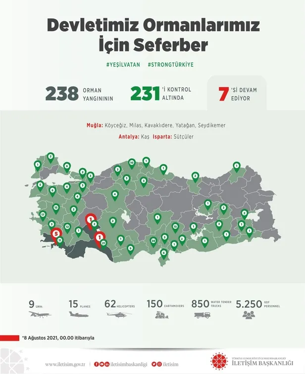 00.17 İletişim Başkanlığından yapılan açıklamada, "238 orman yangınının 231'i kontrol altına alınırken, devam eden yangınların söndürülmesi için devletimizin tüm imkanları seferber ediliyor." ifadelerine yer verildi.