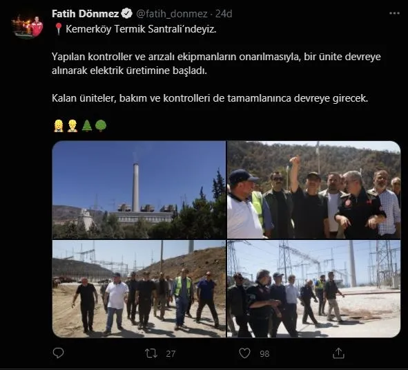 Bakan Dönmez, Twitter hesabından yaptığı paylaşımda, "Kemerköy Termik Santrali'ndeyiz. Yapılan kontroller ve arızalı ekipmanların onarılmasıyla, bir ünite devreye alınarak elektrik üretimine başladı. Kalan üniteler, bakım ve kontrolleri de tamamlanınca devreye girecek." ifadelerini kullandı.