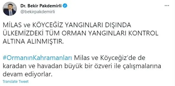SAAT 12.44 Bakan Pakdemirli: Milas ve Köyceğiz yangınları dışında ülkemizdeki tüm orman yangınları kontrol altına alınmıştır. Ormanın Kahramanları Milas ve Köyceğiz'de de karadan ve havadan büyük bir özveri ile çalışmalarına devam ediyorlar.