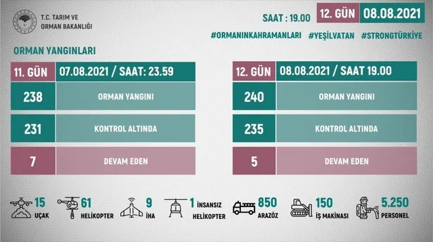 Pakdemirli, Muğla'da 16 orman yangını çıktığını belirterek "6 uçak, 39 helikopter, 630 arazöz, 128 iş makinesi ve 3 bin 600 personel görev yaptı." ifadesini kullandı.