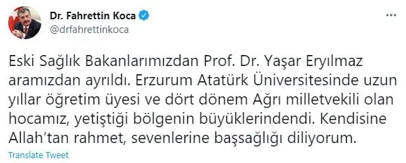 Sağlık Bakanı Fahrettin Koca, Twitter hesabından yaptığı paylaşımda, "Erzurum Atatürk Üniversitesinde uzun yıllar öğretim üyesi ve dört dönem Ağrı milletvekili olan hocamız, yetiştiği bölgenin büyüklerindendi. Kendisine Allah'tan rahmet, sevenlerine başsağlığı diliyorum." ifadelerini kullandı.