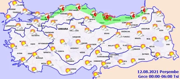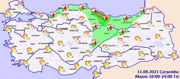 Meteoroloji Genel Müdürlüğü tarafından yapılan son değerlendirmelere göre; Ülkemizin kuzey, iç ve doğu kesimlerinin parçalı ve yer yer çok bulutlu, Marmara'nın kuzey ve doğusu, İç Anadolu'nun kuzey ve doğusu, Karadeniz, Doğu Anadolu'nun kuzey ve batısı ile Edirne, Kırklareli, Tekirdağ, Kütahya, Eskişehir, Çankırı, Adana'nın kuzeyi, Osmaniye, Kahramanmaraş, Muş, Van'ın doğusu, Hakkari'nin kuzeyi ve Adıyaman çevrelerinin yerel olmak üzere aralıklı sağanak ve gök gürültülü sağanak yağışlı, diğer yerlerin az bulutlu ve açık geçeceği tahmin ediliyor. Yağışların; Karadeniz kıyıları ile Tokat, Erzincan, Gümüşhane ve Bayburt çevrelerinde kuvvetli, Sinop, Samsun ve Ordu çevreleri ile Kastamonu'nun kuzeyi ve Bartın'ın doğusunda yer yer çok kuvvetli ve şiddetli (51-100 kg/m2) olması bekleniyor.