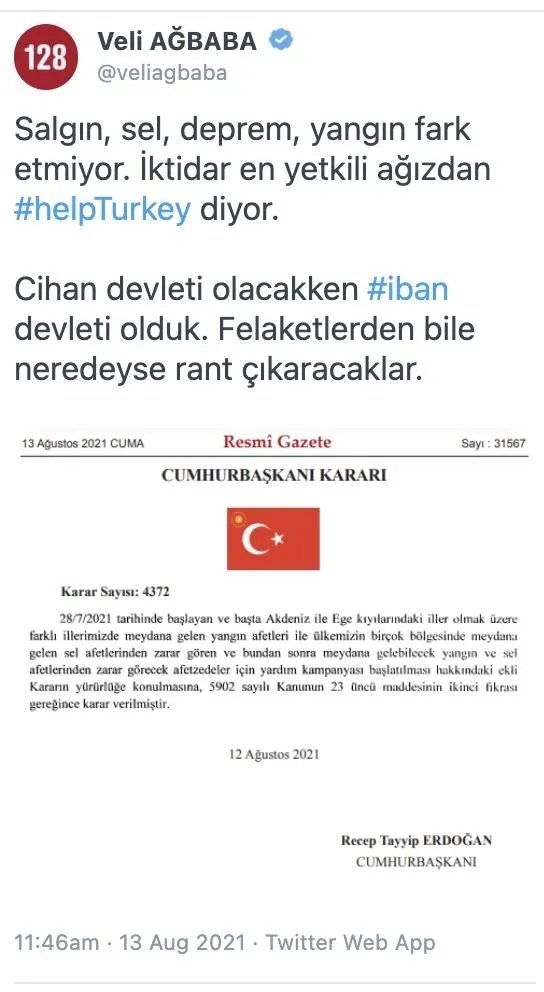 CHP Genel Başkan Yardımcısı Veli Ağbaba: Salgın, sel, deprem, yangın fark etmiyor. İktidar en yetkili ağızdan #helpTurkey diyor. Cihan devleti olacakken iban devleti olduk. Felaketlerden bile neredeyse rant çıkaracaklar.