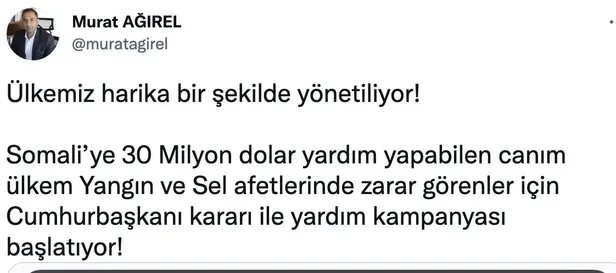 Yandaş İsmail Saymaz: Sultanahmet'te dilenip Ayasofya'da sadaka vermek nedir bilir misiniz? Aşağıdaki gibidir: 5 Ağustos… Cumhurbaşkanlığı, Somali'ye 30 milyon dolar hibe verilmesini kararlaştırdı. 13 Ağustos… Cumhurbaşkanlığı, yangın ve selden ötürü vatandaştan yardım toplanmasını kararlaştırdı.