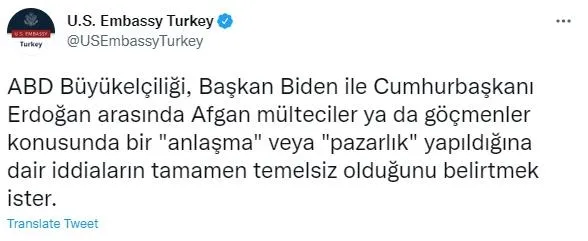 Büyükelçiliğin Twitter hesabından yapılan açıklamada, "ABD Büyükelçiliği, Başkan Biden ile Cumhurbaşkanı Erdoğan arasında Afgan mülteciler ya da göçmenler konusunda bir 'anlaşma' veya 'pazarlık' yapıldığına dair iddiaların tamamen temelsiz olduğunu belirtmek ister." ifadeleri kullanıldı.