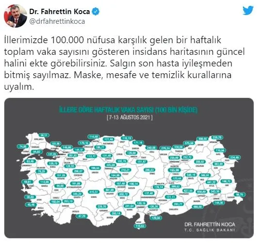 Sağlık Bakanlığı 81 il için 7-13 Ağustos'ta her 100 bin nüfustaki Kovid-19 vaka sayılarını açıkladı.