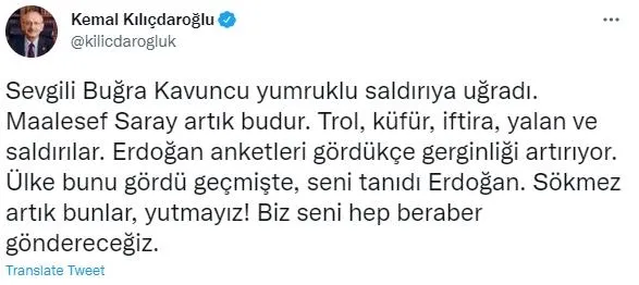 CHP lideri Kemal Kılıçdaroğlu, "Sevgili Buğra Kavuncu yumruklu saldırıya uğradı. Maalesef Saray artık budur. Trol, küfür, iftira, yalan ve saldırılar. Erdoğan anketleri gördükçe gerginliği artırıyor. Ülke bunu gördü geçmişte, seni tanıdı Erdoğan. Sökmez artık bunlar, yutmayız! Biz seni hep beraber göndereceğiz." sözleriyle alçak bir iftiraya imza attı.