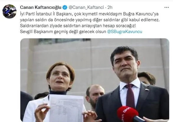Kavuncu'nun yakın çalışma arkadaşı CHP İstanbul İl Başkanı Canan Kaftancıoğlu saldırının arından paylaştığı "geçmiş olsun" mesajında "gelecek" vurgusu yaptı.