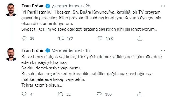 CHP'li Eren Erdem ise "İYİ Parti İstanbul İl başkanı Sn. Buğra Kavuncu'ya, katıldığı bir TV programı çıkışında gerçekleştirilen provokatif saldırıyı lanetliyor, Kavuncu'ya geçmiş olsun dileklerimi iletiyorum. Siyaseti, gerilim ve sokak şiddeti arasına sıkıştıran kirli dili lanetliyorum…" mesajını paylaştı.